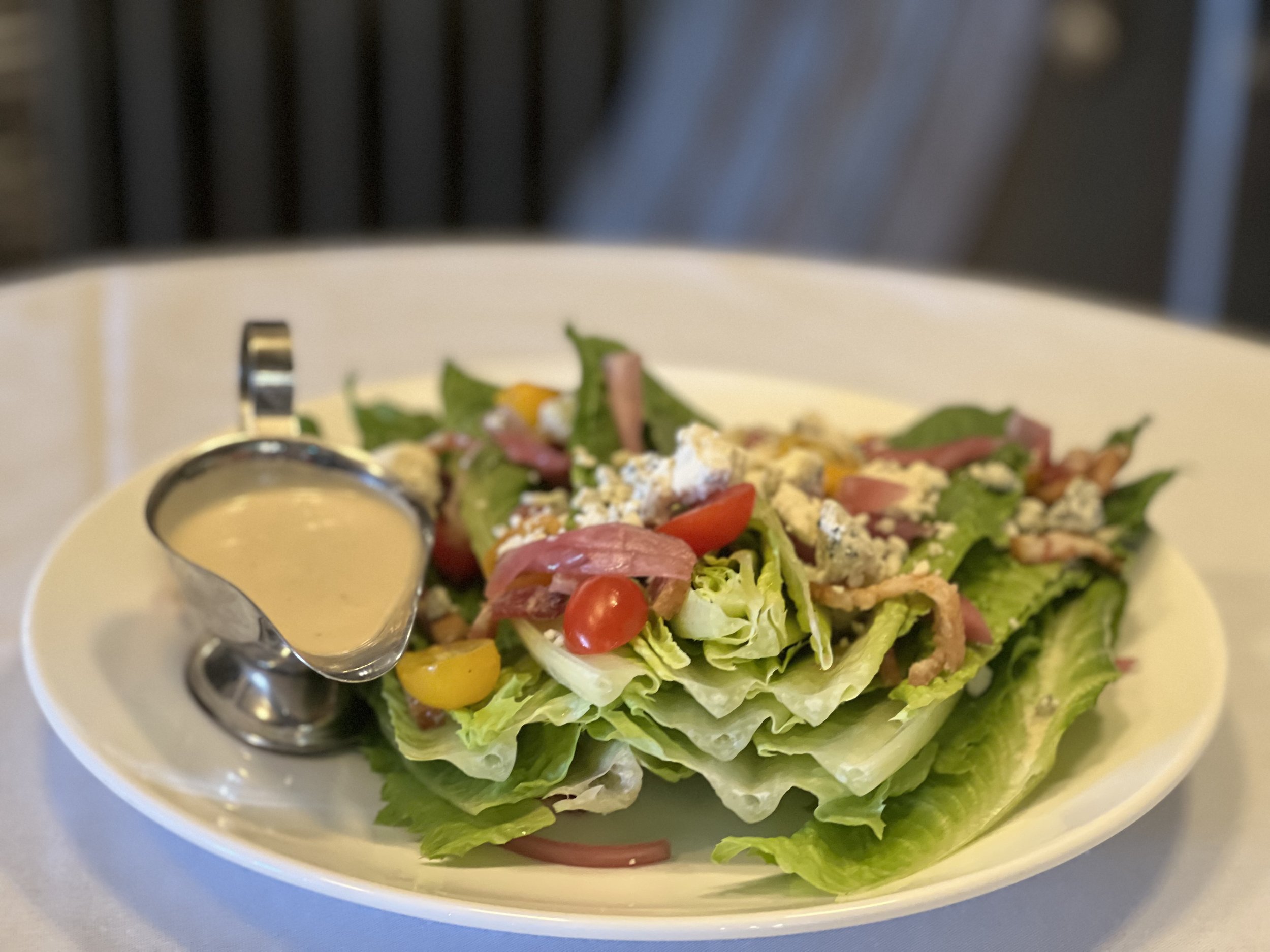 Artisan Romaine Wedge-Cherrywood-Smoked Bacon, Pickled Onions, Cherry Tomatoes, and Maytag Blue Cheese Dressing (GF) $14