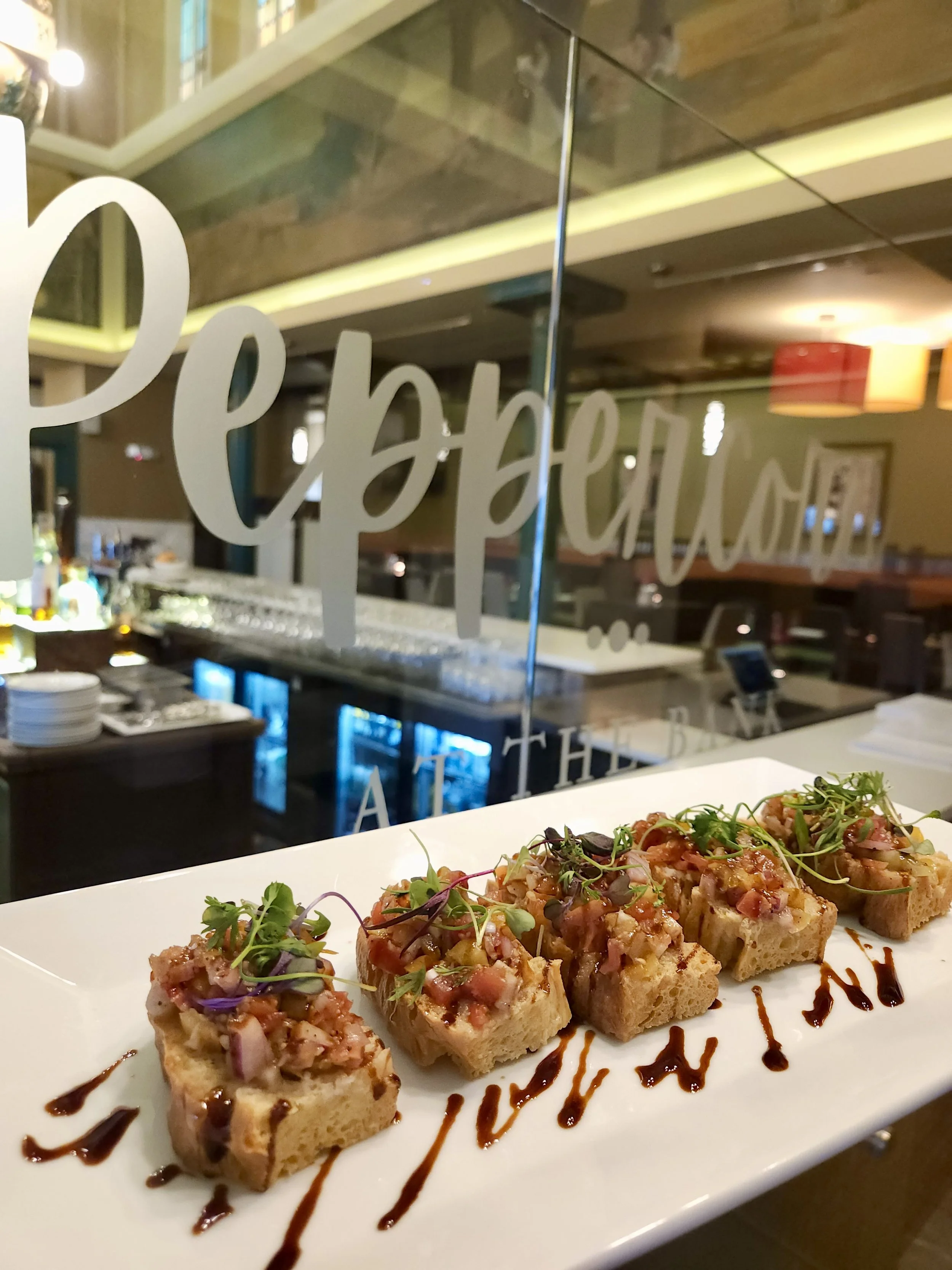 Crispy Glazed Pork Belly-Sweet Chili Glaze, Charred Poblano Aioli, Apple Pepper Relish, and Cilantro (GF & DF) $13